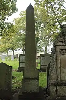 The grave lies east of the church and is marked by an obelisk. The inscription is eroding.