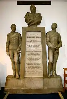 A memorial to Scarlett was installed in the Royal Garrison Church at Aldershot. It includes a marble bust of Scarlett flanked by two full-size marble cavalry troopers of his former regiments, the 18th Hussars and 5th Dragoon Guards, wearing VCs, four-bar Crimean War medals and Long Service and Good Conduct medals.[17]