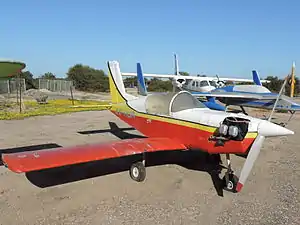 The fuselage was a light alloy semi-monocoque with a nose-mounted 65 hp (48 kW) Continental A65 flat-four engine driving a fixed pitch, two-blade propeller. The single-seat cockpit placed the pilot over the wing under a two-piece blown canopy. The Gypsy Hawk had a fixed, unfaired tricycle undercarriage.[1]