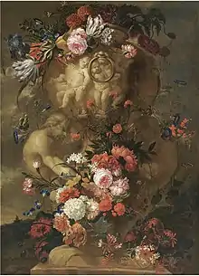Bosschaert collaborated with various specialist painters including the figure painter Jacob Leyssens[10] The Antwerp painter Peeter-Frans Bailliu painted the vases, figures and grisailles in some of his compositions.[3][11] The collaborative works involved typically a female figure representing an allegorical or mythological figure or putti with a large flower piece. This likely went back on 16th century motifs of the goddess Flora in her garden.[12]