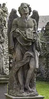 De Cock was one of the artists who worked on the creation of a group of statues referred to as the Calvary on the outside of the St. Paul's Church in Antwerp. Its overall design dates from 1697. In 1734 construction of the Calvary was completed but further statues were added up to 1747. It is built as a courtyard and leans on one side against the south aisle of the church and the Chapel of the Holy Sacrament. The structure includes 63 life-size statues and nine reliefs executed in a popular and theatrical style. The statues are arranged into four groups: the angel path, which ascends to the Holy Sepulcher, the garden of the prophets on the left, the garden of the evangelists on the right and the Calvary itself, which consists of an elevated artificial rock, divided into three terraces, on which statues are placed with Christ on the cross at the top.[29] Most statues are of white stone with some made of wood. Some statues are dated or signed. The principal sculptors were de Cock, Michiel van der Voort the Elder and Alexander van Papenhoven with some statues by the hand of Jan Pieter van Baurscheit de Elder, Willem Kerricx and his son Willem Ignatius Kerricx and anonymous collaborators. De Cock also sculpted a number of the statues, 12 of which are signed and 5 of which are attributions. These include various angels carrying symbols of Christ's Passion, various biblical figures as well as a penitent Maria Magdalen.[30][31]