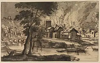 De Cock was a prolific draughtsman who left an extensive body of drawings. Many of these were studies for his sculptures or other objects such as garden vases and cradles. Some were artworks in their own right such as the Burning city by a river (Herzog Anton Ulrich Museum).[32] Others were designs for illustrations made for the Antwerp printers. We now know that no fewer than five engravers turned his designs into prints, including Jan Antoni de Pooter,, Petrus Balthasar Bouttats, Hendrik Frans Diamaer, Jan Baptist Jongelinck and Norbert Heylbrouck the Elder.[5]