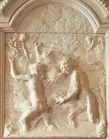 De Cock also made a set of four sculpture groups representing the four continents (Princeton University Art Museum). The set once were in the collection of the American statesman Elias Boudinot IV (1740–1821). The continents are personified by women shown with bear attributes characterizing each continent and its peoples. Europe features a domed temple, papal crown, books, arms and armor, grains, flowers and a horse. These symbolized Europe's religious, cultural and military achievements and its abundant resources, which in the European ideology of that time was deemed to reflect the Christian God's favor.[22] Another allegorical group is the Allegory of War and Peace (Stedelijk Museum Breda), a terracotta sculpture, which was possibly created at the time of the peace talks in the War of the Spanish Succession held in 1710 in Geertruidenberg.[23][24] An example of the work he did for the Princes of Orange in the Dutch Republic are the bas reliefs with the mythological scenes of Alpheius and Arethusa and Apollo en Daphne, both signed and dated 1707. They are located in the house at the Korte Vijverberg 3, The Hague, where the Dutch cabinet holds its meetings. These companion pieces depict scenes of mythological lovers taken from Ovid's Metamorphoses.[25][26]