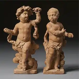He known for his allegorical representations of children. An example are a pair of terracotta figures representing Air and Fire. The Africa boy stands for the element Fire because of the association of black people with the heat of the African sun.[17] The statues may also be allegorical representations of the continents Europe and Africa. They were likely created as workshop models for larger stone and marble compositions. These terracotta models appealed as individual works of art and were collected by contemporary collectors.[18] Among his allegorical representations of children are a few busts and statues of African boys, such as the African boy with a crown in the form of a fortress (1704, Rijksmuseum in Amsterdam),[19] the marble Bust of a black boy (1705–10, Victoria and Albert Museum)[14] and the bronze Bust of an African Boy (Walters Museum). There have also been a number of similar busts attributed to de Cock sold on the art market. These busts may have been based on a particular individual but were also intended to represent a general type of the African[20] The African boys typically wear on their chest a medallion, showing a portrait or a symbol. These were likely connected with the particular preference of the patron for whom the sculpture was produced. For instance, the medallion on the bust in the Victoria and Albert Museum represents a cardinal's hat. This suggests that the boy represented a cleric's page and that the bust was likely commissioned by a cardinal.[21]