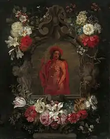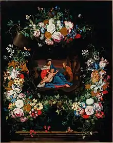 Garland paintings were usually collaborations between a still life and a figure painter.[11] Brueghel collaborated with specialist figure artists who would paint the devotional images in the cartouche while Brueghel painted the flowers and flower garlands in the picture.[1] The Antwerp painter Erasmus Quellinus II was one of his more frequent collaborators on his garland paintings. An example is their collaborative Virgin and Child with St Joseph in a garland of flowers (Christie's online auction of 1-20 October 2020 lot 54). In many works, his collaborators on these works cannot be identified with certainty and are described variously as 'follower of Jan Boeckhorst' as in the Cartouche with a personification of America, surrounded by flowers (Christie's London auction of 26 April 2006 lot 206) or 'circle of Cornelis Schut as in the Mystic marriage of Saint Catherine, surrounded by an oval garland of flowers (Christie's London auction of 3 December 1997 lot 197).[12][13]