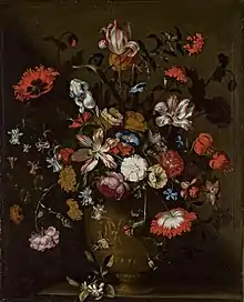 Brueghel painted flower bouquets in vases and flower garland paintings.[1] Only a few fully or partially signed paintings have been located. An example is the Floral still life with roses in a glass vase (Dorotheum Vienna auction of 21 October 2014, lot 25), which is one of a pair of flowers still lifes and bears the signature 'J. P. Brueghel'.[8] As he signed some of his works with 'Jan Br., some of his works have been attributed to his father and grandfather.[6]