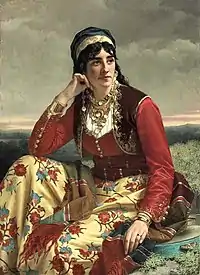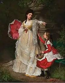His genre pictures featured elegant women in gardens or luxurious interiors. Some were dressed in Orientalist style. He also collaborated with other painters, such as Eugène Rémy Maes and Frans Lebret (1820–1909), who provided the backgrounds and foreground details for his portraits.