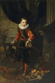 In addition to the work he produced as an independent artist, he collaborated with other artists. He is known to have collaborated regularly with Anthony van Dyck during the two periods that van Dyck stayed in Genoa (1621 and 1625–1627).[6] Some see the brush of Roos in the still lifes that appear in van Dyck's Vertumnus and Pomona[7] and in Diana and Endymion.[8] The style of van Dyck influenced Roos' work as can be seen in the Portrait of a boy, now in the Museo del Prado. Some of Roos' works such as The holy family (Parochial church of Moltedo, Imperia) have in the past been attributed to van Dyck.[9]