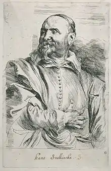 In 1574 Snellinck was in Antwerp where he got married on 10 July of that year to Helena de Jode, a daughter of the printmaker and publisher Gerard de Jode. The couple had three sons named Daniel, Gerard and Jan who all trained under their father to become painters.[11][12] A grandson called Cornelis and a great grandson called Jan were painters in Rotterdam.[13] His first wife died on 12 September 1581. He remarried in 1586 to Paulina Cuypers (alias Boschmans), who was a relative (possibly the sister) of the mother of Anthony van Dyck. The couple had 10 children of whom three sons became painters.[11]