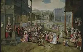 A Masked ball in an Italianate courtyard, depicting a ball in the courtyard of a palace seen from a high perspective (Auctioned at Christie's on 7 December 2011, London, lot 106) and an Elegant company listening to music (Auctioned at Christie's on 7 December 2011, London, lot 106), depicting elegantly dressed men and women listening and dancing to harpsichord music, show another aspect of his work.[18] This theme of elegant balls was introduced in Flemish art by members of the Francken family of artists such as Hieronymus Francken I.[21]
