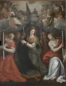 Snellinck gradually established a reputation as evidenced by the commissions he received from Peter Ernst I von Mansfeld-Vorderort, an Imperial and Spanish army commander of German origin and Governor of the Spanish Netherlands from 1592 to 1594, and from the Archdukes Albrecht and Isabella, who were also governors of the Spanish Netherlands from 1598 to 1621.[9] His appointment to court painter of the Archdukes may have been related to his work on a commission by the government of Antwerp for the manufacture of a set of seven tapestry works, which were to serve as decorations on the occasion of the joyful entry in Antwerp of the Archdukes Albert and Isabella Clara Eugenia as the new governors of the Spanish Netherlands on 10 December 1599. The tapestries together with the cartoons painted by Snellinck were later gifted to the Archdukes.[11][15][16] The tapestries were then given by Archduke Albert to King Philip III before 1621 or sent to King Philip IV after the death of Archduchess Isabella in 1633. They remained in the royal tapestry collection.[15] Snellinck also received commissions for altarpieces in Antwerp, Mechelen and Oudenaarde.[11]