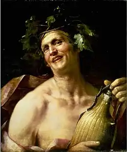 Van Dalen painted a number of portraits of Bacchus, the ancient god of fertility and wine. In the version in the Museum of Fine Arts (Budapest) the artist possibly portrayed himself as the laughing Bacchus.[7] In the version in the Kunsthistorisches Museum Jan van Dalen gave the deity a mischievous and challenging expression which appears to invite the viewer to enjoy a glass of wine with him. The wild and boisterous character of the god and his disregard for, and transgression of, limits and borders are emphasized by the wreath of ivy he is wearing.[8]