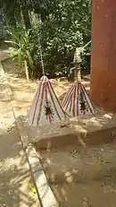 The first museum building in the complex is the Lokamatha Mandira where exhibits consist of various types of rural household items and agricultural tools. Right at the entrance to this building there is a very large grinding stone, which used to be operated by two buffaloes, and was put to use during marriage celebrations.[12] The household items of daily use by rural folk on display are cooking vessels, jars to store pickles, salt containers and serving utensils made of stone, wood and mud.[9][12] Brass and copper vessels used for worship, tools and tackles used for harvesting and climbing trees to pluck coconuts and areca nuts, large sized pots made of mud used for storing grains, old hand-looms are also exhibited here. The paintings in this museum hall are made from natural colours and these were part of marriage decorations in tribal houses; which is still a prevalent practice among many tribes, particularly pertain to the work culture of tribal women.[2]