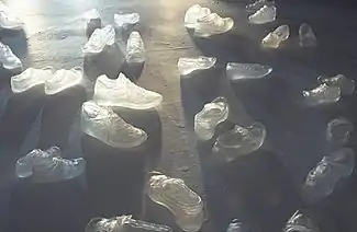 In related works, Mulfinger explored monochromatic effects (the all-blue Deluge, 1990),[28] geographies, source materials and media. For Caught in Passing (1994)—done in residency at the New York Experimental Glass Workshop[30]—she cast 22 pairs of rejected shoes from Salvation Army thrift stores in crystal, reconstituting the abject discards into an homage to unknown lives[3] that The Independent (London) called a "beautifully surreal" work of "ghostly translucence."[29][4][31] The installation I Battuti Bianchi ("The White Flagellants," 1991) referenced the symbolic gowns of a historical sect in Carignano, Italy by sewing white, second-hand clothing into a hot air balloon-like structure housed in the town basilica, creating a cluster of associations around sacred and profane garments and the human desire for ascendance, through science and spirituality.[32][3] For Armory as Cathedral, Beyond the Visible Spectrum (2002), Mulfinger covered the outside of two 45' x 7' skylights with tarpaulins of sewn garments facing the same direction, one red and one blue.[33][34] Set at a former armory (now the Armory Center for the Arts), and exposed to wind and weather, the iconically color-coded panels pointedly referenced the nation's political, religious, and social divisions.[33][34]