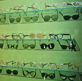 In the 1990s, Mulfinger frequently used found text and symbols in works that examined cultural history, the elusiveness of memory, and the simultaneous potency and limits of language.[27][35][4][36] In several series, she etched second-hand prescription eyeglasses with braille, Morse code or musical notation (Spectacles, 1991), poetry (No Vacancy, 1991),[37] or first-hand accounts of intense sensory experiences (Lost for Words, 1991), often one word or phrase per lens; lined up on glass shelves, the dramatically lit, delicately shadowed pieces formed hard-to-read passages or paragraphs.[38][39][27][4] Critics, such as Sue Hubbard, described them as "subtle, witty and poetic" takes on the paradoxes of comprehension and mystery, illumination and blindness.[40][14][36][39]