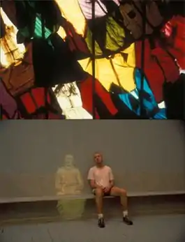 Mulfinger's early work probed collective experience, memory and history through found objects, images and interventions in architectural space.[16][3] In installations such as Norris, R.E. and Rhoberts I (both 1989), she transformed exhibition spaces into sites of contemplation and optical effects by sewing locally collected, discarded clothing into tarpaulins that were fit over skylights, creating multi-colored panels resembling cathedral stained glass.[28][2][3][15] Beneath them, she altered the environments by painting walls, covering windows in fabric, and adding continuous benches or chairs. She sometimes projected images of seated individuals from different historical periods onto the benches.[29][27] Writers suggested that the work connected viewers to a cycle of life, death, presence and absence.[2] Curator Kate Bush wrote, "unfolding through the passage of time, recuperable through memory, and incarnate in the objects we leave behind".[3]