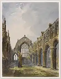 The ruin of Holyrood Abbey with the remaining arches, columns and windows (1868)