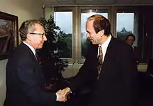 Janez Drnovšek (Slovene pronunciation: [ˈjàːnɛz dəɾˈnɔ́ːwʃək];[1][2] 17 May 1950 – 23 February 2008) was a Slovenian liberal politician, President of the Presidency of Yugoslavia (1989–1990), Prime Minister of Slovenia (1992–2002, with a short break in 2000) and President of Slovenia (2002–2007).