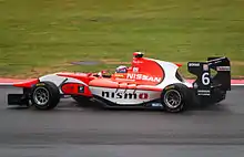 In 2015, Mardenborough was selected as one of the drivers for Nissan Motorsports' entry into the top LMP1 class of the FIA World Endurance Championship (WEC), which includes the 24 Hours of Le Mans. He also continued racing in GP3, switching to Carlin for the 2015 season.[35] Nissan entered the WEC with an unconventional front-engined car, named the GT-R LM Nismo. The team missed the first two races of the season while trying to improve the car, before making their debut at Le Mans.[36] The GT-R LM Nismo proved highly uncompetitive during the race and Mardenborough's No. 23 car broke down terminally with an hour remaining, but he was consistently the quickest of the three drivers in his car.[12][37] Nissan withdrew from the remainder of the season and eventually cancelled the programme at the end of the year.[38] In GP3, he claimed two podiums and scored points on six occasions to finish ninth overall ahead of future IndyCar champion Álex Palou.[39] He missed four races during the season as he took part in a round of the GP2 Series as a substitute for another driver at Carlin and had a testing commitment at the end of the year.[40][41]
