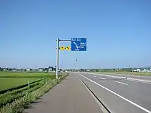 National Route 12 is a 135.7-kilometer-long (84.3 mi) highway in western Hokkaido that runs north from Sapporo to Asahikawa. Its southern terminus lies at an intersection in Chūō-ku, Sapporo where it meets National Routes 36 and 230. Along the way from Sapporo to Asahikawa, it passes through the cities of Ebetsu, Iwamizawa, Takikawa, and Fukagawa.[2] The highway is closely paralleled by the tolled Dō-Ō Expressway and it functions as free alternative route to the expressway between Sapporo and Asahikawa.[3] A notable section of the highway between the cities of Bibai and Takikawa is known for being the longest straight section of roadway in Japan.[4] Marked as being 29.2 kilometers (18.1 mi) long, there is actually a slight curve in Takikawa, bringing the actual length of the straight section of the road down to 27.7 kilometers (17.2 mi).[4] Its northern terminus in Asahikawa is the intersection where it meets National Routes 39 and 40.[5]