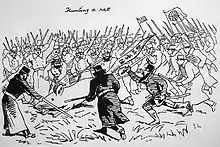 Wirgman published the Japan Punch for 25 years, from 1862 to 1887. Though the publication debuted in 1862, it is known that a total of 64 pages were printed that year, but the number of volumes are unclear, indicating that the magazine was first published irregularly. In 1865, issues were published monthly as the magazine quickly began to gain popularity amongst foreigners. It is believed that the irregularity of the Punch was due to the state of affairs between 1862 and 1865,[1] in which the government threatened to punish those who published content that defamed or ridiculed others, leading to a brief suspension of the publication. On the other hand, some critics such as John Clark attribute this irregularity to major events that occurred in Wirgman's personal life. Clark suggests that Wirgman got married and bought a house during this time and even travelled back to England to settle some loose financial or business ends.[1][2] Wirgman also clearly hinted his leave in the Punch as he exhibited it through a few of his cartoons which showcased a crowd sending him off and an implication of his destination, London.[1] In 1865, he resurrected the Punch by attributing his absence and marking his return to failure in "searching for truth." Wirgman then maintained a regular pace of about ten to twelve issues per year till the end of the publication. He also expanded the Punch's boundaries from criticising media press and satirising local society to focusing on and revealing the irrationality and issues within port treaty life, critiquing human deficiencies of greed and self-centredness, and domestic politics revolving around the Japanese civil war and the Meiji Restoration.[1]