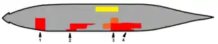 Four torpedoes struck Shinano, at an average depth of 4.27 meters (14 ft 0 in).[27] The first hit towards the stern, flooding refrigerated storage compartments and one of the empty aviation gasoline storage tanks and killing many of the sleeping engineering personnel in the compartments above. The second hit the compartment where the starboard outboard propeller shaft entered the hull and flooded the outboard engine room. The third hit further forward, flooding the No. 3 boiler room and killing every man on watch. Structural failures caused the two adjacent boiler rooms to flood as well. The fourth flooded the starboard air compressor room, adjacent anti-aircraft gun magazines, and the No. 2 damage control station and ruptured the adjacent oil tank.[32]