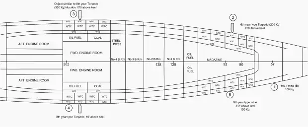 The second and fifth test charges (8 and 13 June) were both placed near the fore main battery magazines. Involving larger charges than the first—about 200 kg (440 lb) (a 6th year type torpedo) and 150 kg (330 lb) (a 9th year type mine)—they were both placed at frame 87: the second to port and 4.04 m (13.3 ft) below the waterline, the fifth to starboard and 6.34 m (20.8 ft) below. Both broached the side protection system—allowing 1,008 and 726 long tons (1,024 and 738 t) of water, respectively, to enter the ship—showing that the usual three-compartment, all-void system used in most Japanese battleships was an insufficient defense against modern torpedoes. The list incurred during test two was a 6° 16' change, resulting in a port list of 4° 36'; for test five these numbers were 4° 38' and a starboard list of 0° 48'.[17]