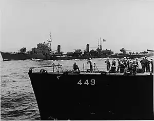 ![]() Hatsuzakura bringing envoys, Tokyo Bay, 27 August 1945. The bow of USS Nicholas is in the foreground. | |