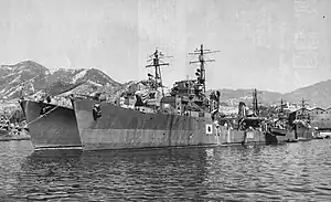 When American carrier aircraft of Task Force 38 attacked Kure Naval Arsenal on 24 July, the destroyer was only slightly damaged, although 16 men were killed and 52 wounded. During a follow-up attack on 11 August, she was again slightly damaged with 19 crewmen killed. The ship was turned over to Allied forces at Kure at the time of the surrender of Japan on 2 September and was stricken from the navy list on 5 October.[5] Kaba was disarmed and used to repatriate Japanese personnel in 1945–1947. The ship was turned over to the United States on 4 August of the latter year and was scrapped by Mitsui Engineering & Shipbuilding at its Tamano facility.[3]
