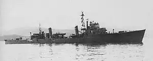 Escort Squadron 31 was transferred to the 5th Fleet on 20 November and the destroyer was slightly damaged the following day. Kiri helped to escort a convoy from Japanese Formosa to Manila, where she arrived on 8 December. She escorted a troop convoy from Manila to Ormoc and back on 9–13 December. The ship was moderately damaged by strafing American aircraft on 12 December and she rescued 214 survivors from the destroyer Yūzuki. Kiri escorted convoys from Manila to Moji, Kyūshū, via Formosa from 14 December to 8 January 1945. The ship arrived at Kure for repairs two days later. She escorted Convoy MOTA-33 from Moji to Keelung, Formosa, beginning on 22 January and later ended up in Shanghai, China. The squadron was assigned to the 2nd Fleet from 15 March to 20 April and then rejoined the Combined Fleet. The ship was turned over to Allied forces at Kure at the time of the surrender of Japan on 2 September and was stricken from the navy list on 5 October.[9][10] The destroyer was disarmed and used to repatriate Japanese personnel in 1945–1947. Kiri was turned over to the Soviet Union on 29 July of the latter year[7] at Nakhodka.[11]
