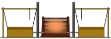 The smelting process used is different from the modern mass production of steel. A clay vessel about 1.1 m (3 ft 7 in) tall, 3 m (10 ft) long, and 1.1 m (3 ft 7 in) wide is constructed. This is known as a tatara. After the clay tub has set, it is fired until dry. A charcoal fire is started from soft pine charcoal. Then the smelter will wait for the fire to reach the correct temperature. At that point he will direct the addition of iron sand known as satetsu. This will be layered in with more charcoal and more iron sand over the next 72 hours. Four or five people are needed to constantly work on this process. It takes about a week to build the tatara and complete the iron conversion to steel. Because the charcoal cannot exceed the melting point of iron, the steel is not able to become fully molten, and this allows both high and low carbon material to be created and separated once cooled. When complete, the tatara is broken to remove the steel bloom, known as a kera. At the end of the process the tatara will have consumed about 9.1 t (9.0 long tons; 10.0 short tons) of satetsu and 11 t (11 long tons; 12 short tons) of charcoal leaving about 2.3 t (2.3 long tons; 2.5 short tons) of kera, from which less than a ton of tamahagane can be produced.[3] A single kera batch can typically be worth hundreds of thousands of dollars, making it many times more expensive than modern steels.[4]