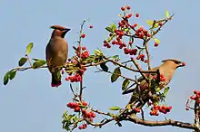 Unlike the other species of waxwing, it lacks the row of waxy red feather-tips on the wing which gives the birds their name. Japanese waxwings often occur in mixed flocks with Bohemian waxwings which, as well as having the row of waxy tips, are slightly larger with a yellow tail-tip, greyish centre to the belly and no reddish-brown stripe across the wing.