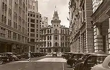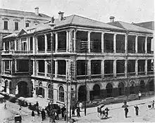 The first three generations of Jardine Houses were situated at 20 Pedder Street, at the corner of Des Voeux Road Central. The first Jardine House was probably built around 1841 after Jardine's successful bid for its lots on The Praya Central. This first building was designed in a style typical of many commercial buildings in 19th Century Hong Kong and borrows elements (arches and pillars) from Neoclassical architecture. In 1908, the second Jardine House was built.[5] It was rebuilt in around 1956 as a 16-storey building.[6] The building was sold by Jardines during the land acquisition exercise of the Landmark complex in Central and 20 Pedder Street is now occupied by the Wheelock House.