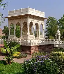 The cenotaph's grounds feature carved gazebos, a tiered garden, and a small lake. There are three other cenotaphs in the grounds. The cenotaph of Maharaja Jaswant Singh displays portraits of the rulers and Maharajas of Jodhpur.[3]