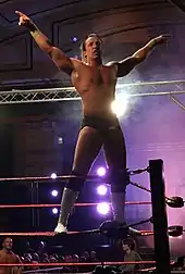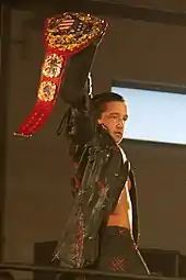 White left for Japan on New Year's Eve 2015, began further training as a young lion upon his arrival, and made his debut for NJPW on 30 January 2015, losing to Alex Shelley.[8] White lost all but eight of his matches in 2015, as is common for young lions in NJPW. In 2016, White began gaining more victories, and on 27 March competed in his biggest match to date when he was defeated by then-reigning IWGP Intercontinental Champion Kenny Omega in a non-title match.[9] White's final match in NJPW took place on 19 June 2016 at Dominion 6.19 in Osaka-jo Hall, when he, David Finlay, and Juice Robinson were defeated by Satoshi Kojima, Hiroyoshi Tenzan, and Manabu Nakanishi.[10] White left for his excursion to the United States the following week.