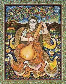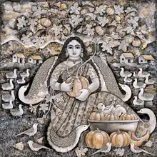 Her primary painting mediums are watercolours, ink, charcoal and acrylic on canvas. Most often centring on nature, gods and goddesses, her original depictions combine folk, myth and mythology to tell stories of deities who braved adversities. [4]