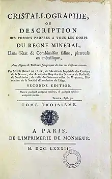 1. Cristallographie, seconde édition. Imprimerie de Monsieur. 1783; 4 vols. with atlas as 4th vol.{{cite book}}: CS1 maint: postscript (link)