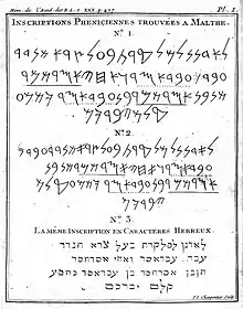 - ↑ Barthélemy, Jean-Jacques (1736). "Réflexions sur quelques monuments Phéniciens, et sur les alphabets qui en résultent". Mémoires de littérature, tirés des registres de l'académie royale des inscriptions et belles-lettres. 30 (read 12 April 1758): 405–427.