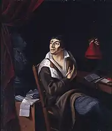Marat received his early education in the city of Neuchâtel and there was a student of Jean-Élie Bertrand, who later founded the Société typographique de Neuchâtel.[8] At 17 years of age he applied for the expedition of Jean-Baptiste Chappe d'Auteroche to Tobolsk to measure the transit of Venus, but was turned down.[11] His first patronage was fulfilled with the wealthy Nairac family in Bordeaux, where he stayed for two years. He then moved to Paris and studied medicine without gaining any formal qualifications. After moving to France, Jean-Paul Mara francized his surname as "Marat".[12] He worked, informally, as a doctor after moving to London in 1765 due to a fear of being "drawn into dissipation". While there he befriended the Royal Academician artist Angelica Kauffman. His social circle included Italian artists and architects who met in coffee houses around Soho. Highly ambitious, but without patronage or qualifications, he set about inserting himself into the intellectual scene.