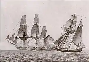 On 19 June, Jean Bart captured two American ships: the 200-ton brig Elizabeth, and the 300-ton, 6-gun three-masted ship Weymouth, Gardner, master, both from Boston and bound for Palerme with loads of sugar, coffee, pepper, tobacco and various other goods. They were sent to France but the arrival of Elizabeth to France in unconfirmed, while Weymouth was recaptured.[5] The next day, she captured the British brig Liffey, from London and bound for Palerme with various goods, which surrendered after a brief artillery exchange,[6] and sent her to France.[5] On 1 July, Jean Bart was intercepted by a British cruiser, which she narrowly managed to elude after a running battle.[7]