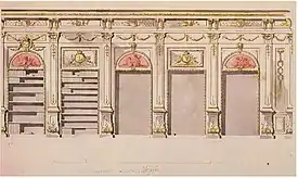 He was heavily employed by the Royal Court as well, doing interior design work for Queen Louisa at Drottningholm Palace. Later, in 1779, he oversaw the changes at Gripsholm Castle and Stockholm Palace, which had been ordered by King Gustav III. He also redecorated parts of the Bollhuset (1772) and designed furniture with Georg Haupt.