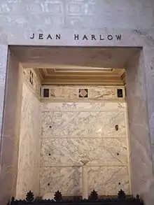 Harlow was interred in the Great Mausoleum at Forest Lawn Memorial Park in Glendale in a private room of multicolored marble, which William Powell bought for $25,000 (equivalent to approximately $508,912 in 2022[19] dollars).[103] She was laid to rest in the pink negligee she'd worn in Saratoga and in her hands she had a white gardenia along with a note that Powell had written: "Goodnight, my dearest darling." Harlow's inscription on her crypt reads, "Our Baby".[104]