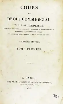 His lectures were published under the title Cours de droit commercial (4 volumes, 1813–1817). In 1815 Pardessus was elected deputy for the department of Loir-et-Cher, and from 1820 to 1830 was constantly re-elected; then, however, he refused to take the oath of allegiance to Louis Philippe, and was deprived of his office. After the publication of the first volume of his Collection des lois maritimes antérieures au XVIIIème siècle (1828) he was elected a member of the Academie des Inscriptions et Belles Lettres.[1]