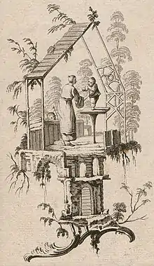 Pillement's illustrations are a mixture of fantastic birds, flora & fauna, large human figures and chinoiserie. He often worked with printmakers such as Anne Allen, who would become his wife.[1] His designs were used by several engravers and decorators on porcelain and pottery, but also on textiles, wallpaper and silver. Pillement had discovered in 1764 a new method of printing on silk with fast colours (recorded in his Memoirs). One of his prime vehicles was the single print marketed independently of an album. He published many albums, one is: Νvre de fleurs, ornements, cartouches, figures et sujets chinois (1776).