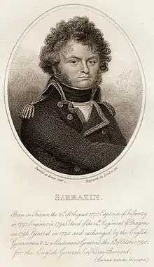 On 10 June 1810, Sarrazin went over to the British and revealed French weaknesses. Condemned in absentia to death by a conseil de guerre,[lower-alpha 1] he did not return to France until the Bourbon Restoration. He offered his services to Napoléon Bonaparte during the Hundred Days, but was thrown in prison. Pardoned in 1822, he went into exile in London and then Brussels, where he died.[1]
