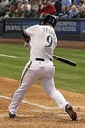 In the offseason, Segura played in the Dominican Winter League, and won the league's batting title with a .324 batting average, as he was also 2nd in the league with 11 stolen bases.[15] He was named the Brewers' Opening Day shortstop in 2013.[14] He was a National League reserve for the 2013 MLB All-Star Game. He won the Player of the Week Award on May 12 and finished the year hitting .294/.329/.423 with 10 triples and 44 stolen bases (each 2nd in the NL), 12 home runs, an 18.9 power–speed number (9th in the league), and 7.0 at bats per strikeout (10th-lowest) in 588 at-bats.[16] At the same time, his walk percentage of 4.0% was tied for the 6th-lowest in major league baseball.[17]
