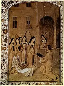 Jean de Meun presents his French translation of Boethius' Consolation of Philosophy to Margaret of Anjou in a fanciful miniature from the 15th-century manuscript Jena, Bibliothek der Friedrich-Schiller-Universität, Ms. fol. 85