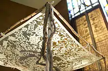 Kuvin Oren (born in 1961) graduated from Princeton University (B.A. 1983) and Yale University (M.P.H. 1985). Kuvin Oren has been a full-time artist of Judaica since 1984.[1][2] Kuvin Oren's work has been commissioned by more than 450 synagogues, community centers, day schools and camps. Kuvin Oren creates Torah covers (Torah mantles), Ark curtains, wall-hangings, Glass Ark Doors, mosaics, stained glass, huppahs (wedding canopies), marriage contracts (ketubot)[3] and papercuttings.