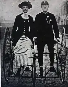 with her husband on a sociable tricycle