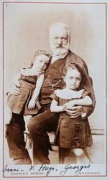 In 1871 Hugo's father died from a stroke. Her mother later remarried the actor Édouard Lockroy.[1] Hugo's grandfather did not approve of the new marriage, and took custody of Hugo and her brother, Georges. In 1877 she and her brother were the focus of her grandfather's book of poetry titled L'Art d'être grand-père.[2][3] When she was eleven years old, she was gifted a walrus-tusk paper cutter by the Finno-Swedish explorer Baron Adolf Erik Nordenskiöld from his voyage in the Arctic Ocean aboard the SS Vega. Her grandfather died in 1885,[4] leaving her with a vast inheritance.[5]